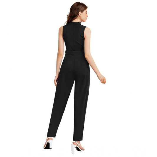 Generic Women's Knitting stretchable Solid Round Neck Sleeveless Jumpsuit (Black)
