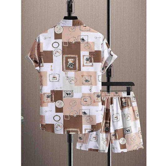 Generic Men's Lycra Printed Half Sleeve Shirt and Shorts Set (Cream)