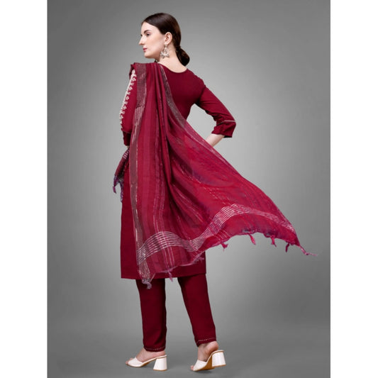 Generic Women's Casual 3-4 th Sleeve Embroidery Cotton Kurti Pant Dupatta Set (Maroon)