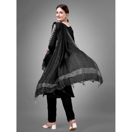 Generic Women's Casual 3-4 th Sleeve Embroidery Cotton Kurti Pant Dupatta Set (Black)