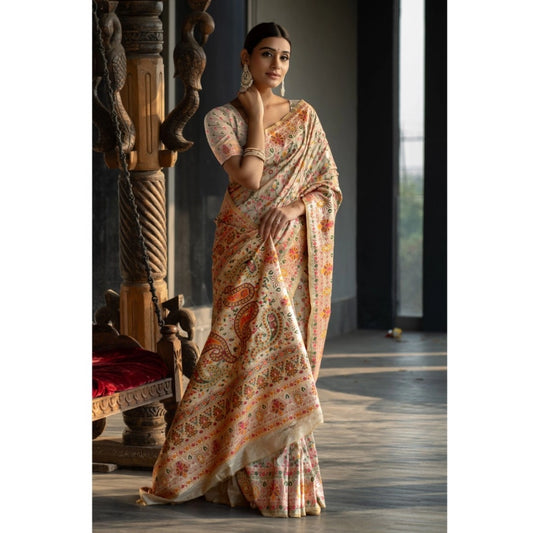 Generic Women's Linen Printed Saree With Unstitched Blouse (Beige, 5-6 Mtrs)