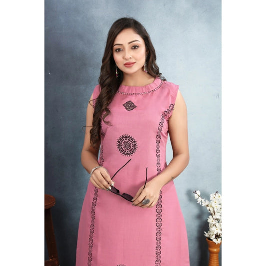 Generic Women's Silk Printed Round Neck Kurti with Pant Set (Pink)
