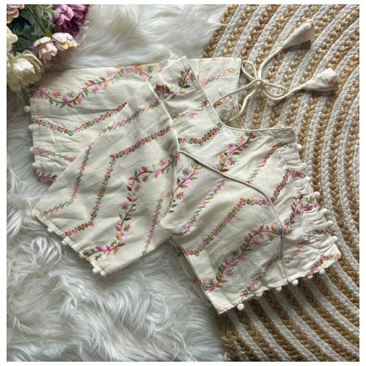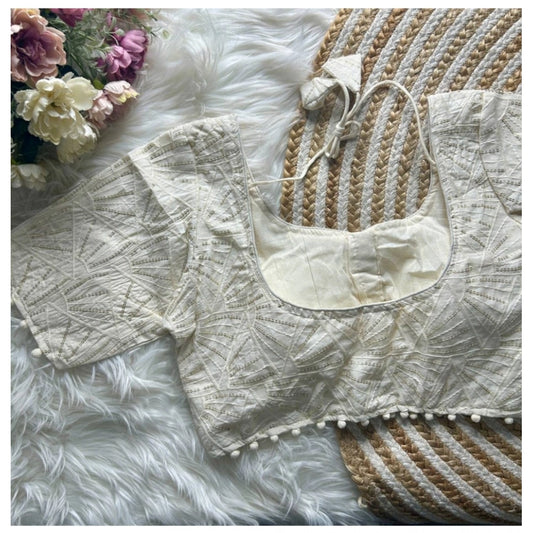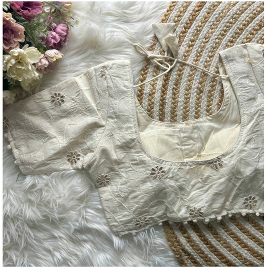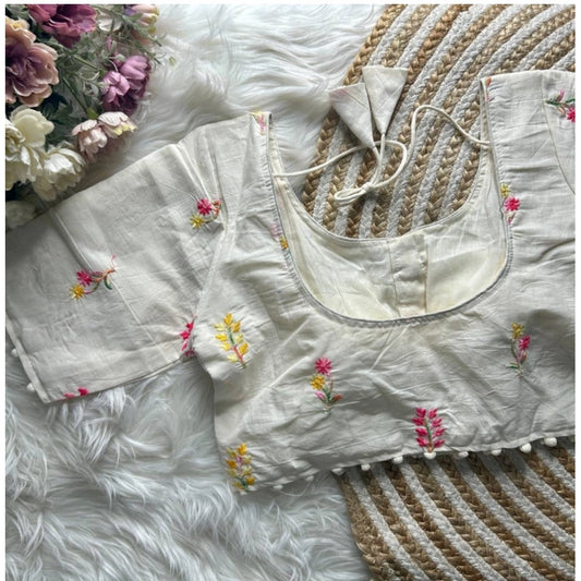 Generic Women's Khadi Cotton Embroidery Round Neck Short Sleeve Readymade Blouse (White, Free Size)