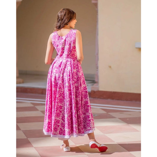 Generic Women's Casual Sleeveless Printed Cotton Kurti Set (Pink)