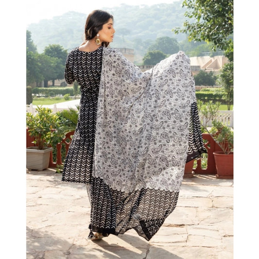 Generic Women's Casual 3/4th Sleeve Printed Cotton Kurti Set (Black)