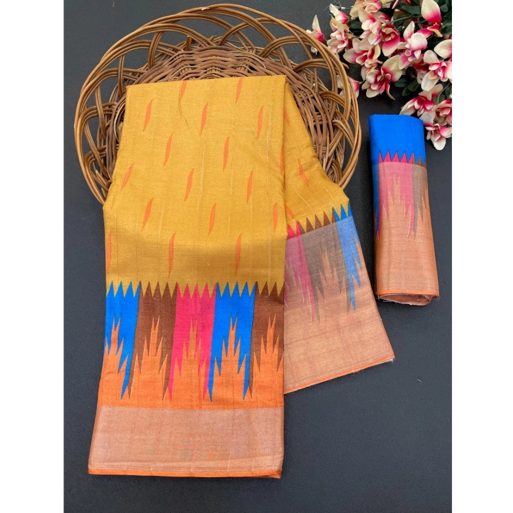 Generic Women's Cotton Blend Printed Saree With Unstitched Blouse (Mustard, 5-5 Mtrs)