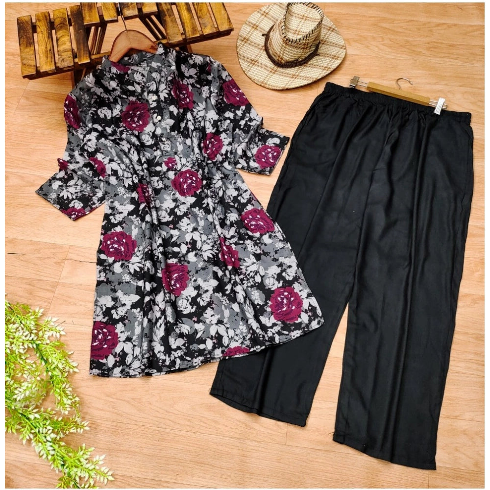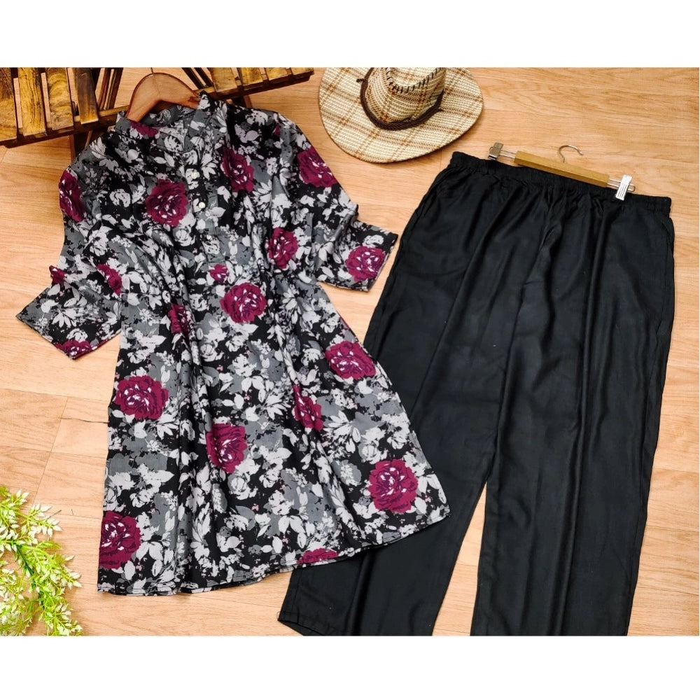Generic Women's Muslin Printed Mandarin Collar 3-4th Sleeve Kurti With Pant Set (Grey)